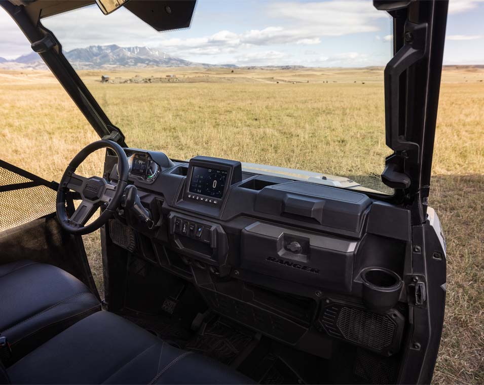 Cadran analogique à double balayage du côté du conducteur avec centre d'information du conducteur à cristaux liquides de 4 pouces à couleurs multiples : Consommation et régénération (%), état de charge de la batterie (%), autonomie restante, taux de charge, température de la batterie, température du moteur, tension des accessoires, compteur de vitesse, compteur kilométrique, compteur journalier, indicateur de vitesse, indicateur et codes d'entretien, intervalles d'entretien programmables, rappel de ceinture de sécurité, rétroéclairage et luminosité réglables par l'utilisateur, horloge. Sièges haut de gamme découpés et cousus avec dossiers profilés et marquage Polaris brodé, volant et garnitures intérieures haut de gamme, système électrique Polaris Pulse (6 positions), prises de courant continu, double port USB, port SAE 12 V situé dans la boîte à gants avec interrupteur marche/arrêt au tableau de bord.